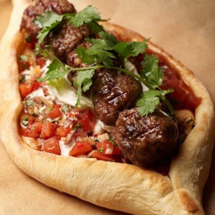 Хачапури с тефтельками из ягненка, пряными томатами и страчателлой