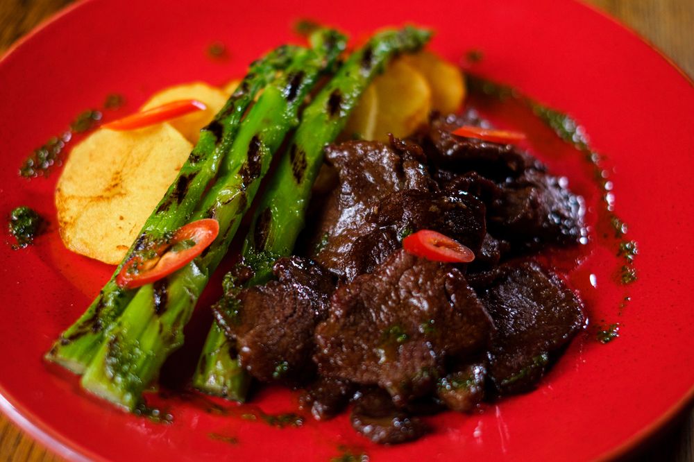 Филе говяжьей вырезки, маринованное в особом маринаде, быстро обжаренное на раскаленной сковороде