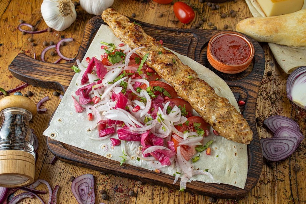 Со свежими томатами, луком, гранатом, гурийской капустой и соусом «Сацебели»