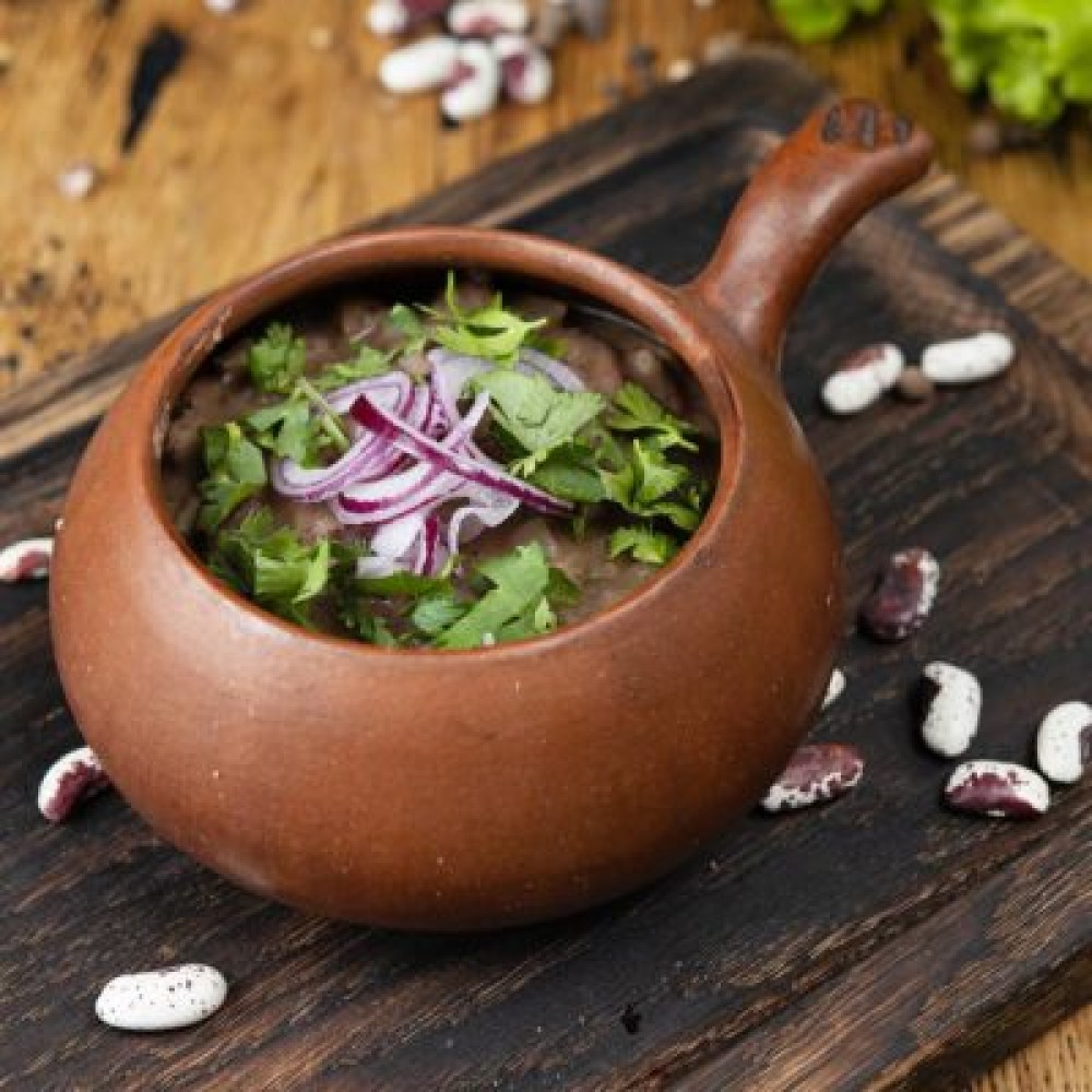 Из цельной красной фасоли, обжаренной с луком, ароматными травами, по традиционному грузинскому рецепту. Подаётся с капустой по-гурийски