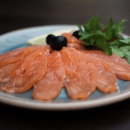 Лосось шеф-посола, угорь жареный в соусе унаги, лосось холодного копчения. Подается с лимоном, маслинами и зеленью