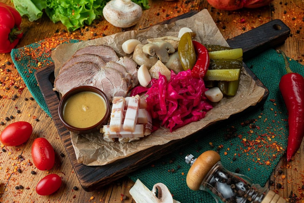Буженина, сало соленое с чесночком, домашние соленые грузди, соленые огурцы, капуста по-гурийски, маринованный чеснок. Подается с горчицей