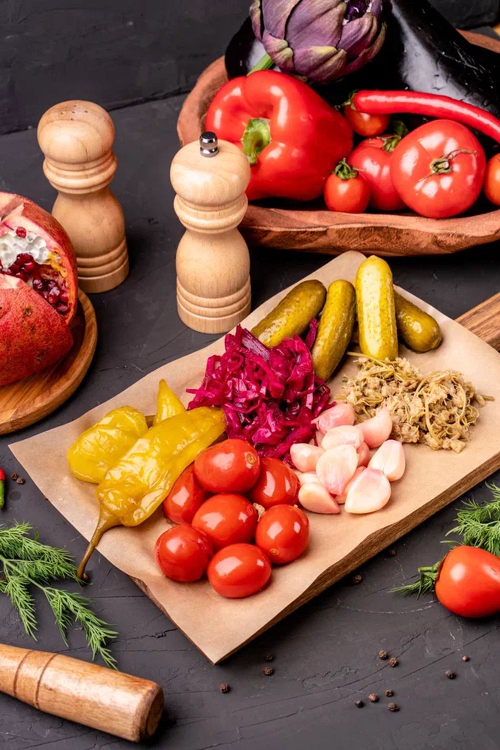 Домашние соленые огурцы, томаты, маринованный чеснок, перец чили, капуста по-гурийски, джонджоли