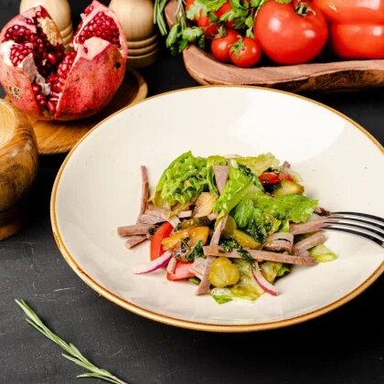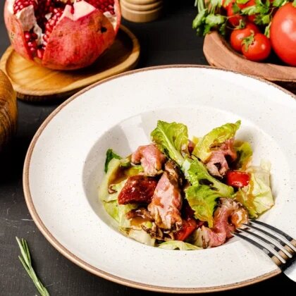 Тёплый салат из куриного шашлыка с копчёным сулугуни