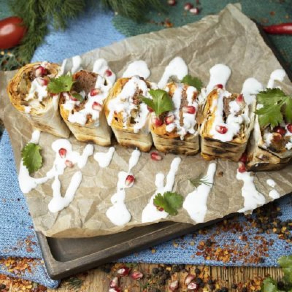 Кебаб из говядины и свинины в лаваше с сулугуни и печеными овощами