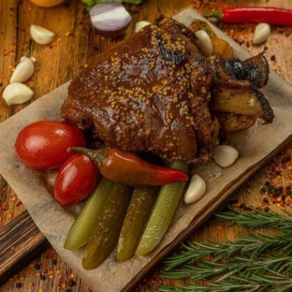Национальное блюдо грузинской кухни цыплёнок, жаренный на сковороде под прессом. Подается с соусом сацебели