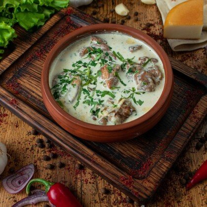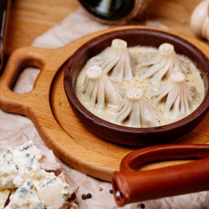 Патара хинкали из говядины и свинины в соусе с сырами Пармезан и "Дор-блю"