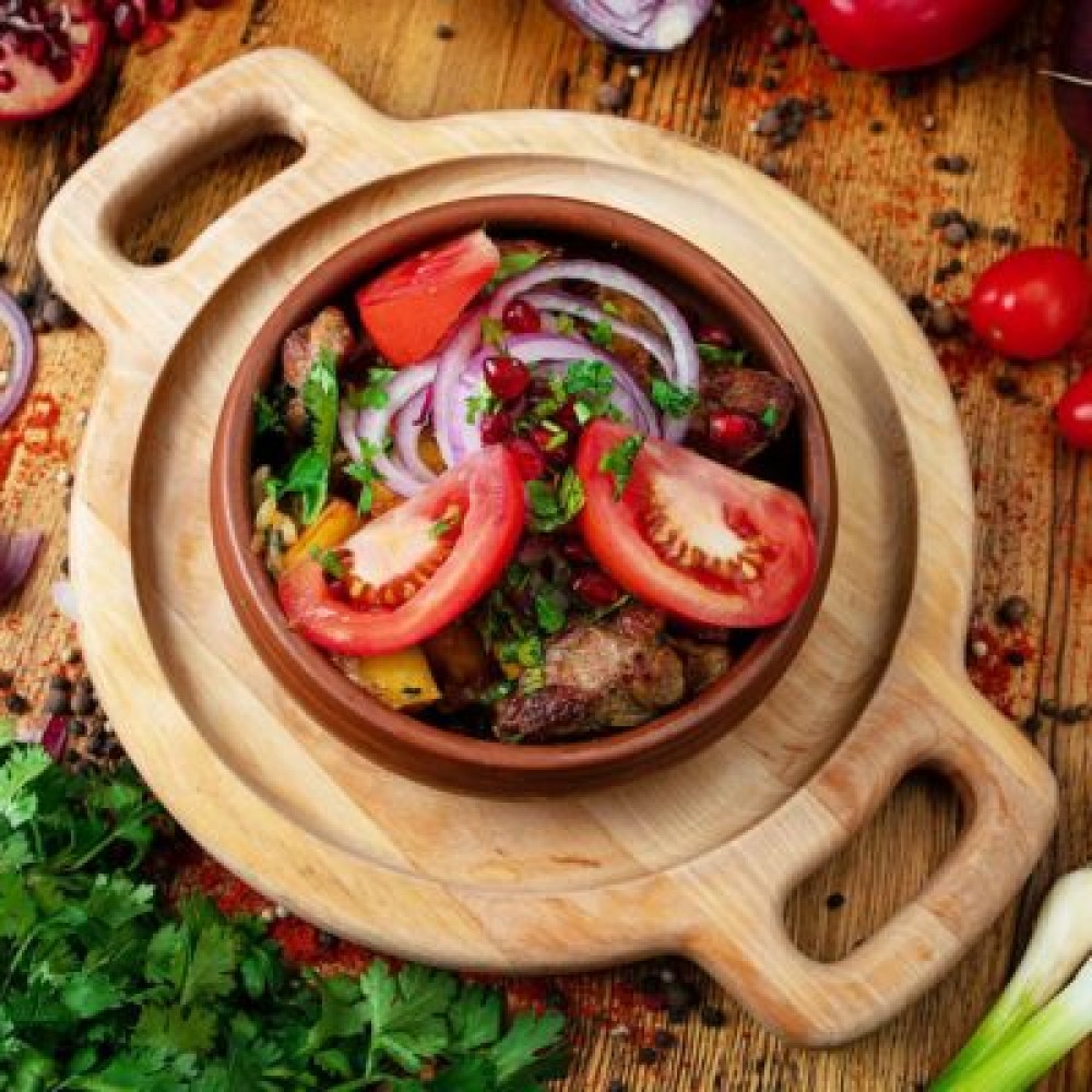 Жаренная свинина с запеченным картофелем, репчатым луком, томатами, чесноком, грузинскими специями и зеленью.