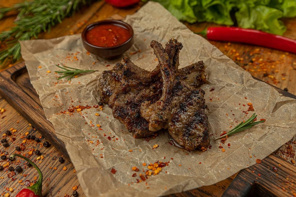 Каре ягненка жареное на мангале, подается с соусом сацебели