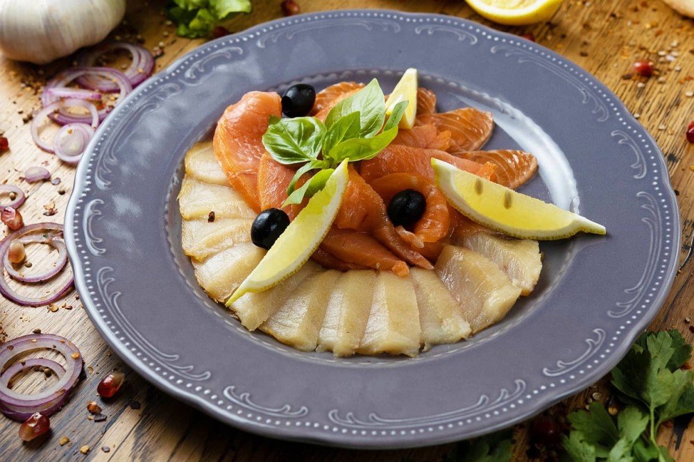 Лосось шеф-посола, масляная рыба холодного копчения, лосось холодного копчения, подается с лимоном, маслинами и зеленью