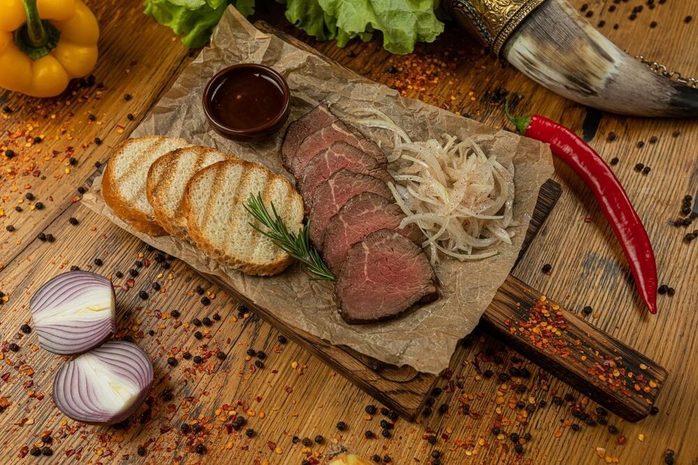 Маринованная говяжья вырезка, жареная до состояния медиум. Подается с маринованным луком, фирменным соусом и тостами из французского багета