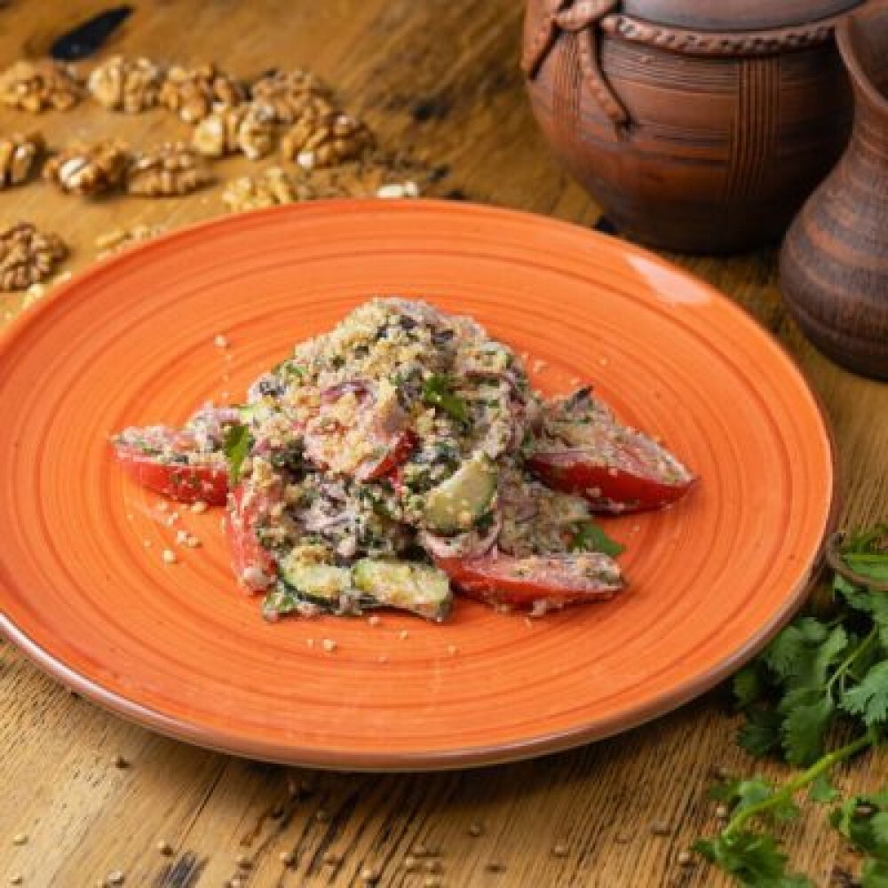 Салат из микса сочных салатных листьев, свежих огурцов, томатов и красного лука. Заправлен соусом на основе оливкового масла, соуса наршараб и бальзамического уксуса. Подается с грецким орехом.