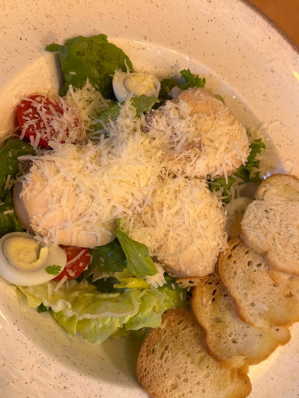 Жареная куриная грудка на миксе сочных листьев салата с томатами черри и чесночными гренками, заправляется классическим соусом "Цезарь" , посыпается сыром Пармезан.