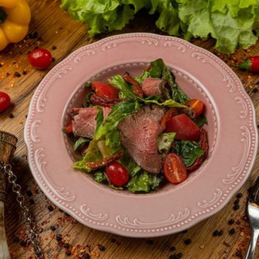 Салат из ростбифа собственного производства, томатов черри и листа романо. Заправлен пряным соусом на основе оливкового масла с добавлением перца чили, чеснока и маринованных огурцов. Украшается вялеными томатами.